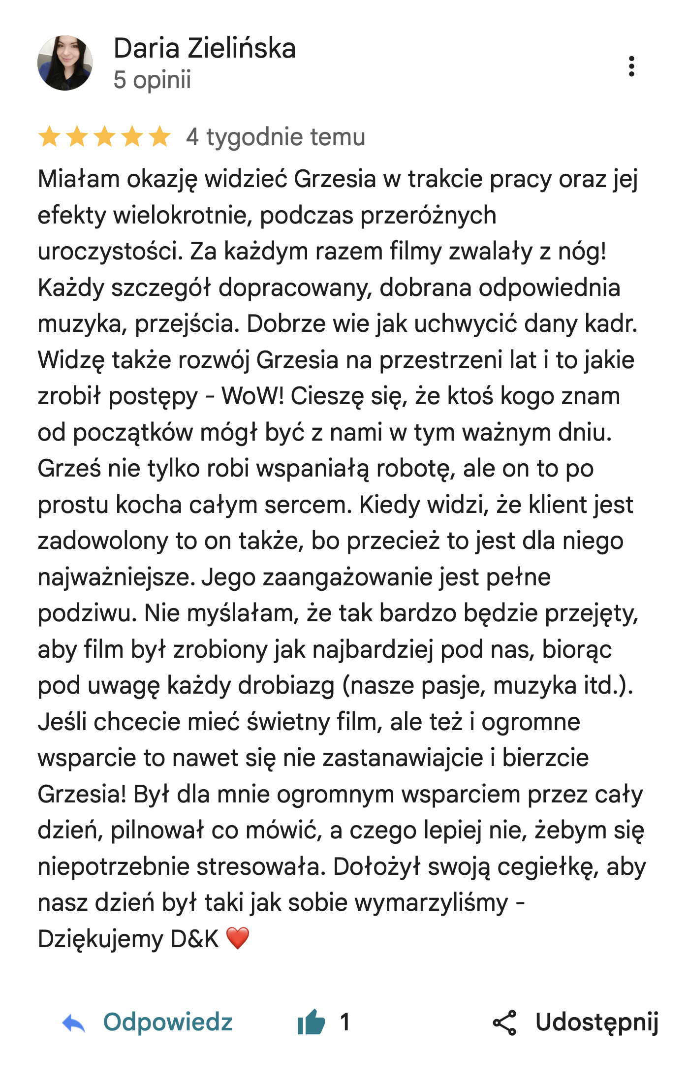 Opublikowano na Kasia KrólikowskaTrustindex sprawdza, czy pierwotnym źródłem recenzji jest Google. Grzesiek filmował ślub brata naszej swiadkowej i to ona nam go poleciła, od razu wiedzieliśmy że chcemy żeby on filmował nasz ślub i wesele! O taką energię nam chodziło, fun i emocje. Ale nie spodziewałam się że wyjdzie taka torpeda! Mega! Super dobór muzyki, różne kadry, piękne światło, cudowne ujęcia gości wszystko tak jak sobie wymarzyliśmy a nawet lepiej. Mamy cudowną pamiątkę! Dziękujemy i baaaardzo polecamy wszystkim! ❤️❤️😱Opublikowano na Adrianna CelińskaTrustindex sprawdza, czy pierwotnym źródłem recenzji jest Google. Wybór Grześka na upamiętnienie naszego ślubu i wesela był strzałem w dziesiątkę! Energiczny chłopak z mnóstwem pomysłów i pozytywna energią! Przygotowany przez niego film jest świetny, spełnia wszystkie nasze oczekiwania, które wcześniej przegadaliśmy. Film zarówno rozśmiesza jak i wyciska łzy, idealnie oddaje atmosferę z tego dnia, dzięki czemu mamy wspaniałą pamiątkę. Montaż i dobór muzyki pierwsza klasa! Po otrzymaniu video oglądaliśmy je chyba z 10 razy :DOpublikowano na kTrustindex sprawdza, czy pierwotnym źródłem recenzji jest Google. Jestem bardzo zadowolony z filmu, który dla Nas przygotował Grzesiek. Super montaż, który oddał w całości wyjątkowość tego wydarzenia. Wszystko wspaniale połączone z muzyką. Przed samym ślubem i weselem Grzegorz przeprowadził z nami kilka rozmów, który pomogły w organizacji wszystkiego jak i w stworzeniu tego najlepszego filmu jaki kiedykolwiek oglądaliśmy 😁Opublikowano na AlicjaTrustindex sprawdza, czy pierwotnym źródłem recenzji jest Google. Jako naczelna wśród wybrednych i wymagających uroczyście ogłaszam, że materiały z mojego wesela przygotowane przez Grześka przeszły moje najśmielsze oczekiwania! Oglądając je płakaliśmy ze wzruszenia i ze śmiechu. Grzesiek wydobył w filmie nie tylko całą pozytywną energię i imprezę z naszego dnia, ale także emocje i ciepłe słowa od naszych najbliższych. Już na samym weselu byliśmy bardzo pozytywnie zaskoczeni jak wiele pomysłów i rad dawał od siebie Grzesiek. Cały montaż to bardzo przemyślany scenariusz z dobrze dobranym podkładem muzycznym, bez przypadkowych i nudnych ujęć. Reportaże Grześka to nie tylko opowieść miłosna o nowożeńcach, ale także o miłości od wszystkich bliskich nam ludzi, którzy przecież są z nami w dniu wesela nie bez przyczyny. Dlatego cieszę się, że Grzesiek poświęcił mnóstwo czasu także naszym gościom, aby pokazać w filmie jak ciepły i czuły dla serca był to dzień. Grzesiek, jeszcze raz dziękujemy Ci za obecność na naszym weselu, za autentyczny i spójny film, w który chce się wskoczyć całym sobą, żeby przeżyć to jeszcze raz!Opublikowano na Karol ZielińskiTrustindex sprawdza, czy pierwotnym źródłem recenzji jest Google. Grześ to bardzo pracowity facet, przed nagrywkami wypytał nas czego oczekujemy i nasze oczekiwania zostały spełnione. Praca z nim jest idealna, bo obydwoje lubimy konkrety. Polecam! 😊Opublikowano na Daria ZielińskaTrustindex sprawdza, czy pierwotnym źródłem recenzji jest Google. Miałam okazję widzieć Grzesia w trakcie pracy oraz jej efekty wielokrotnie, podczas przeróżnych uroczystości. Za każdym razem filmy zwalały z nóg! Każdy szczegół dopracowany, dobrana odpowiednia muzyka, przejścia. Dobrze wie jak uchwycić dany kadr. Widzę także rozwój Grzesia na przestrzeni lat i to jakie zrobił postępy - WoW! Cieszę się, że ktoś kogo znam od początków mógł być z nami w tym ważnym dniu. Grześ nie tylko robi wspaniałą robotę, ale on to po prostu kocha całym sercem. Kiedy widzi, że klient jest zadowolony to on także, bo przecież to jest dla niego najważniejsze. Jego zaangażowanie jest pełne podziwu. Nie myślałam, że tak bardzo będzie przejęty, aby film był zrobiony jak najbardziej pod nas, biorąc pod uwagę każdy drobiazg (nasze pasje, muzyka itd.). Jeśli chcecie mieć świetny film, ale też i ogromne wsparcie to nawet się nie zastanawiajcie i bierzcie Grzesia! Był dla mnie ogromnym wsparciem przez cały dzień, pilnował co mówić, a czego lepiej nie, żebym się niepotrzebnie stresowała. Dołożył swoją cegiełkę, aby nasz dzień był taki jak sobie wymarzyliśmy - Dziękujemy D&K ❤️Opublikowano na Weronika CzTrustindex sprawdza, czy pierwotnym źródłem recenzji jest Google. ⭐️⭐️⭐️⭐️⭐️ Jesteśmy bardzo zadowoleni ze współpracy z Grzesiem. Nagranie ze ślubu i wesela wyszło pięknie – wszystko zostało ujęte w naturalny i estetyczny sposób. Kontakt przed i po uroczystości był bezproblemowy, a na samym wydarzeniu fotograf był dyskretny, a jednocześnie uchwycił wszystkie ważne momenty. Efekt końcowy w pełni spełnił nasze oczekiwania. Zdecydowanie polecamy!Opublikowano na Karina GardełoTrustindex sprawdza, czy pierwotnym źródłem recenzji jest Google. Grzegorz sprawdził się nie tylko jako świetny profesjonalista, ale także jako wspaniały „dodatek” do weselnych atrakcji! Jego pomysłowość w tworzeniu historii sprawiła, że film ślubny stał się nie tylko niepowtarzalną pamiątką, ale także cudownym wspomnieniem i przygodą na całe życie! Dziękujemy z całego serca!Opublikowano na Ola GuTrustindex sprawdza, czy pierwotnym źródłem recenzji jest Google. Z Grześkiem współpracowałam przy nie jednej sesji. Niesamowicie kreatywna osoba, profesjonalnie podchodząca do swojej pracy i nie wchodząca w półśrodki. Odpowiedni człowiek na odpowiednim miejscu. Wybierając Grzesia na swojego kamerzystę ślubnego można być pewnym, że film zrobi efekt "WOW" i nie skończy się na kilkukrotnym obejrzeniu wideo ;) Polecam z całego serducha! Wybierz Grzesia jeśli tylko chcesz dostać film, który w 100% odda energię i klimat Twojego dnia ślubu!Opublikowano na K